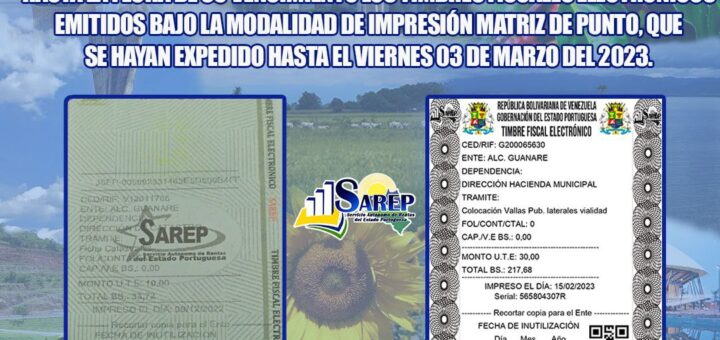 El Servicio Autónomo de Rentas del Estado Portuguesa, a través de la Resolución N°. DESPACHO-G.I.-003-2024, entra en vigencia a partir del 19/03/2024, el nuevo formato de impresión del Timbre Fiscal Electrónico, según el Artículo 1: donde...