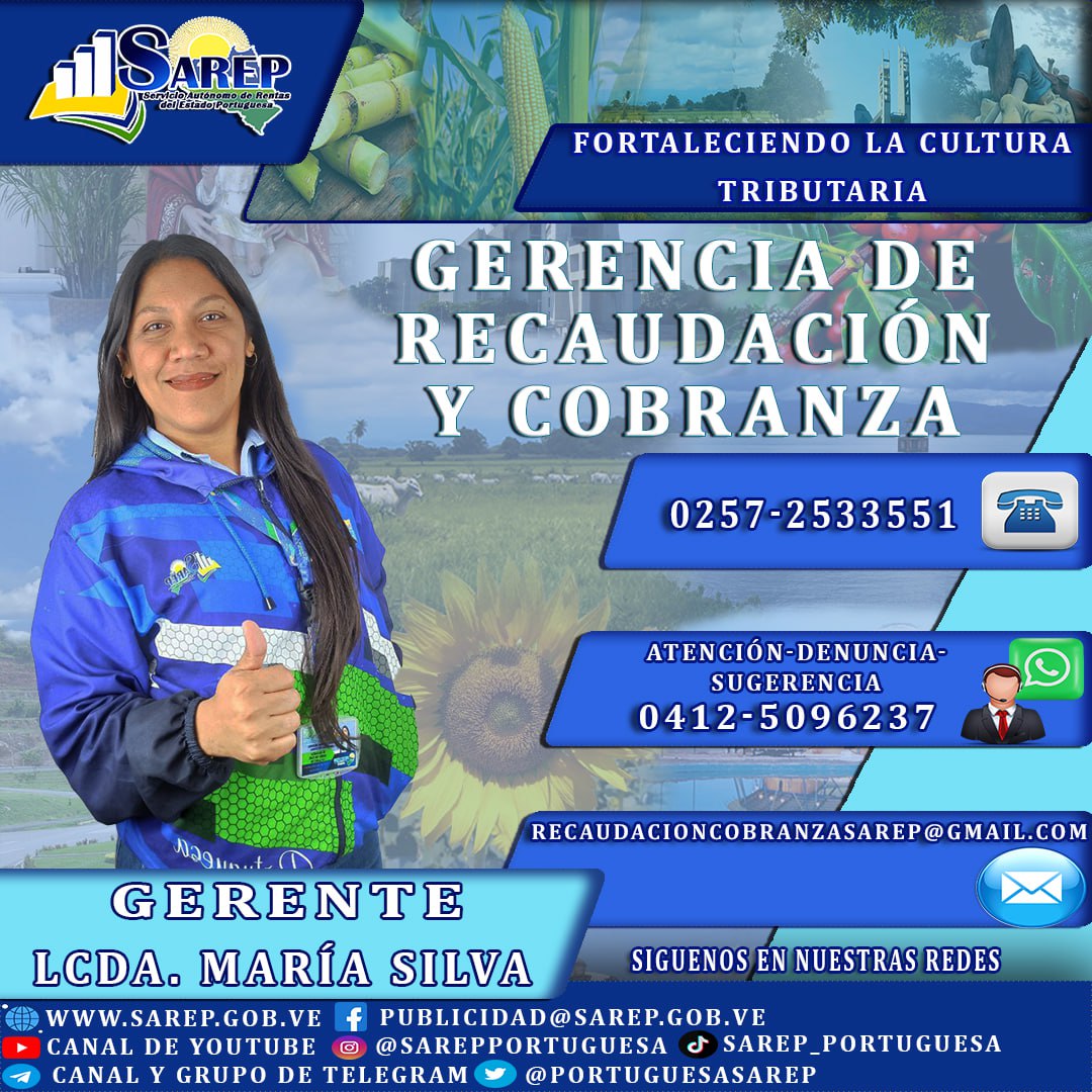 Servicio Autónomo de Rentas del Estado Portuguesa RIF: G-20006563-0 Carrera 5 entre calles 12 y 13. Edif. "Sarep", Barrio "Curazao". Guanare, Portuguesa. Correo-e: direccion@sarep.co.ve | Teléfono: (0257) 253-3551